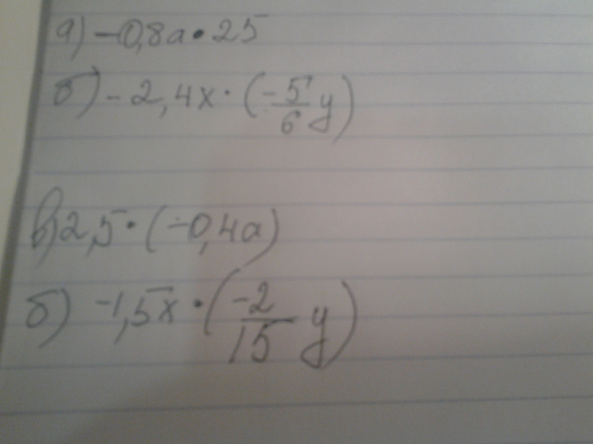 г) - 1,5х * (- 2/15 у) = (- 1,5х * (-2у) / 15 = 2ху/ 10 = ху / 5
