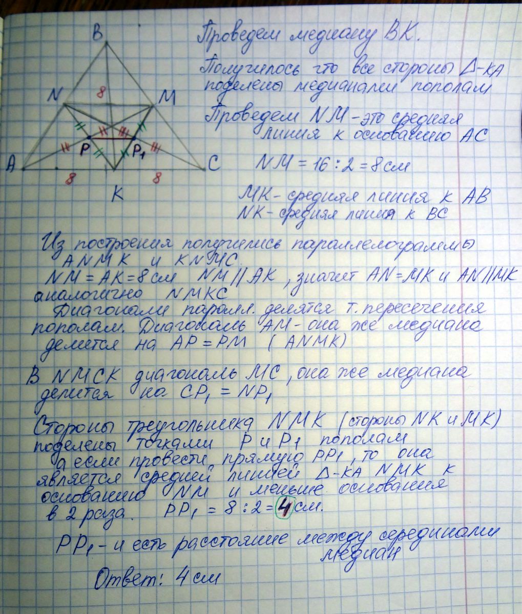 18.В треугольнике АВС проведены медианы АМ и CN. Найдите расстояние между их серединами, если АС = 16 см