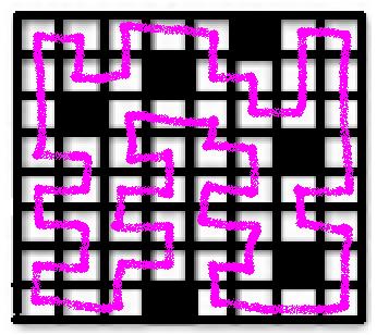 провести замкнутую линию так чтобы она НЕ пересекала черные квадратики, линия НЕ может пересекать сама себя, линия идет только горизонтально или вертикально, должна пройти через все белые квадратики