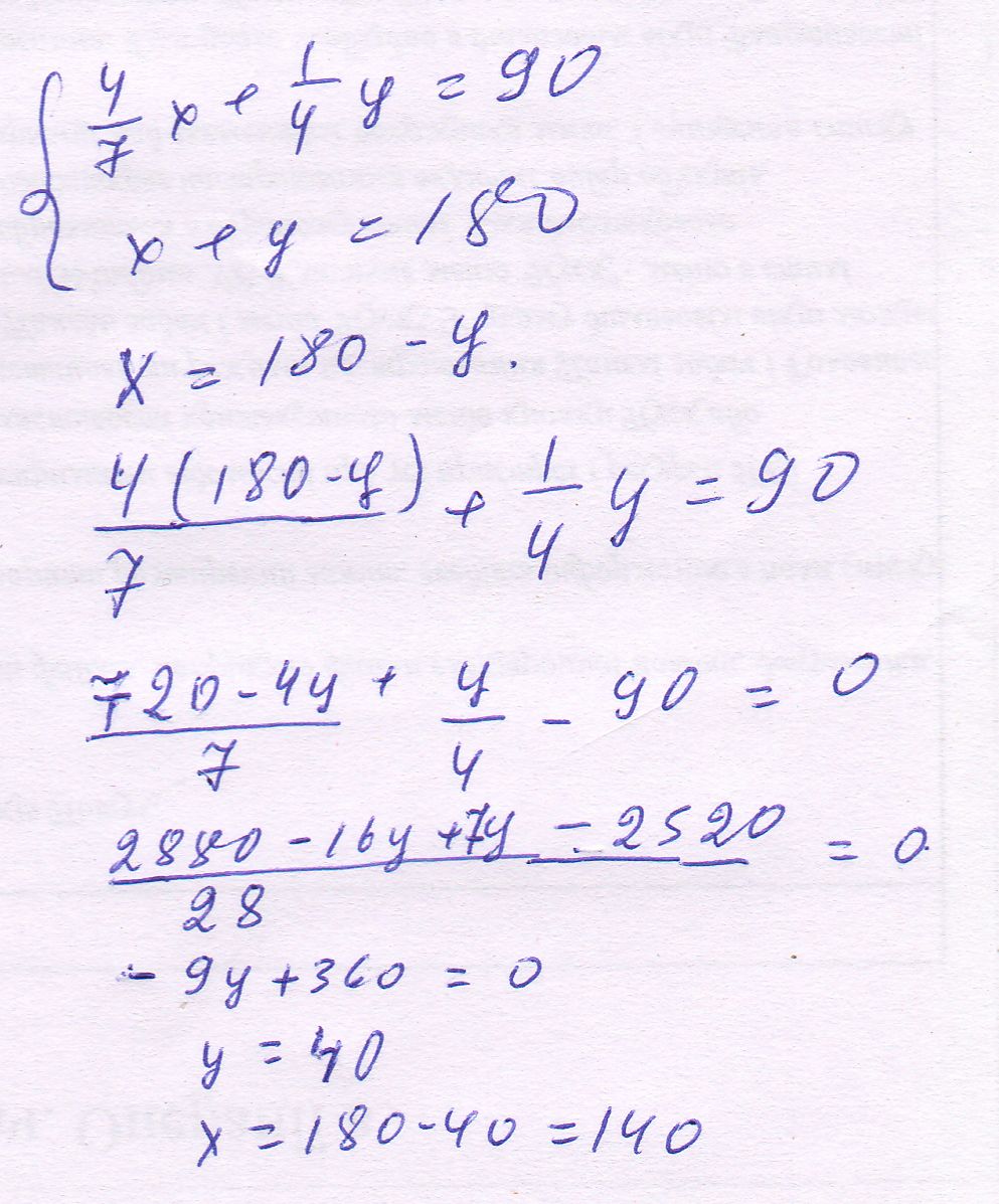 4/7 одного из смежных углов и 1/4 другого составляют в сумме прямой угол. Найдите эти смежные углы. Помогите плиз :3