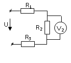Определить ток в цепи, если U2=15 В, R1=3 Ом, R2=5 Ом, R3=5 Ом.