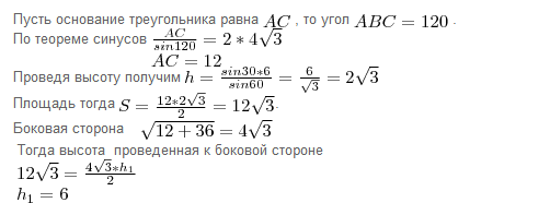 Равнобедренный треугольник ABC вписан в окружность радиуса 4(корень)из 3. Найдите высоту,проведенную к боковой стороне,если один из углов треугольника равен 120 градусов.