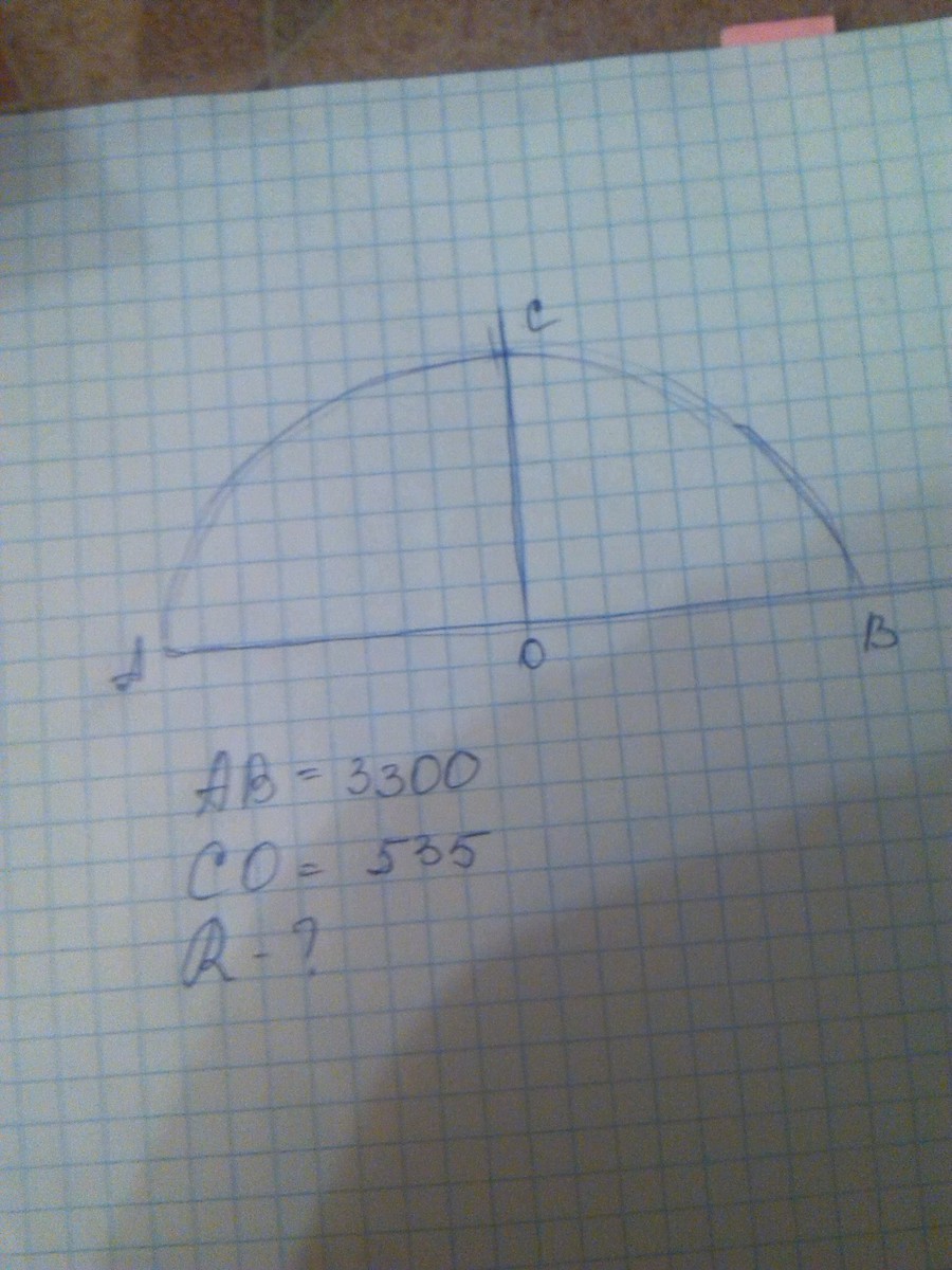 Помогите найти радиус дуги, зная, что хорда (АВ) =3300, высота от хорды до дуги (СО)=535, ОС делит хорду на два равных отрезка.