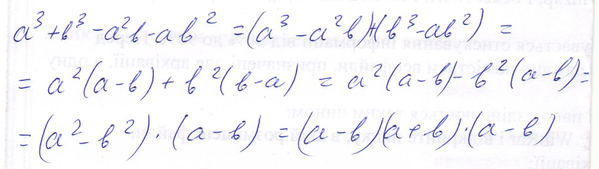 а³+в³-а²в-ав²=(а³-а²в)+(в³-ав²)=а²(а-в)+в²(в-а)=а²(а-в)-в²(а-в)=(а-в)(а²-в²)=