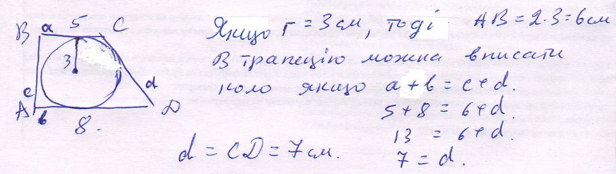 В прямокутну трапецію вписане коло з радіусом 3 см. Знайдіть більшу бічну сторону трапеції я кщо її основи дорівнють 5 см і 8 см.