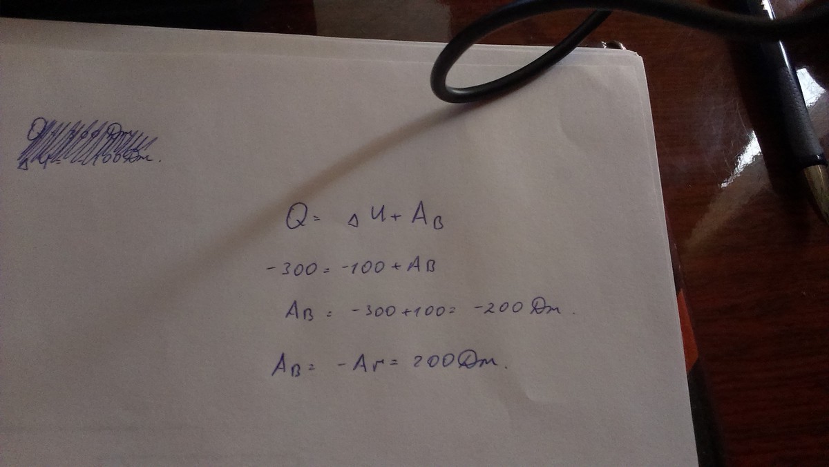 Идеальный газ отдал количество теплоты 300 Дж и при этом внутренняя энергия газа уменьшилась на 100 Дж. Работа, совершенная газом, равна? (Помогите пожалуйста, с объяснением).