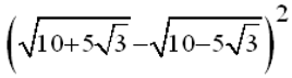 ( sqrt{10+5 sqrt{3} } - sqrt{10-5 sqrt{3}})^2=( sqrt{(sqrt{7.5}+ sqrt{2.5})^2} - sqrt{(sqrt{7.5}- sqrt{2.5})^2} )^2= \ =(sqrt{7.5}+ sqrt{2.5}-sqrt{7.5}+ sqrt{2.5})^2=(2sqrt{2.5})^2=10