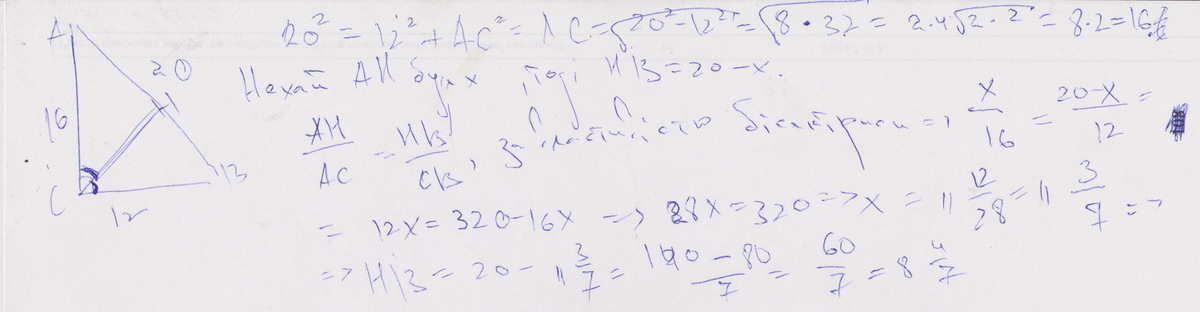 один із катетів прямокутного трикутника дорівнює 12,а гіпотенуза дорівнює 20.Знайти менший з відрізків на які поділяє гупотенузу бісектриса прямого кута.