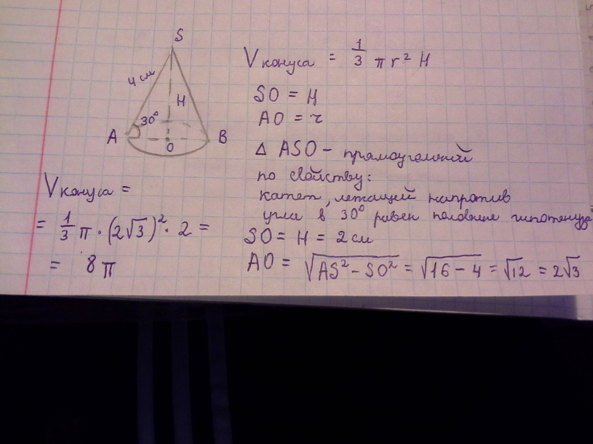 Помогите решить! Задача: Образующая прямого конуса равна 4см и образует с плоскостью основания угол в 30°. Найдите объём конуса