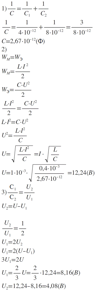 Идеальный колебательный контур состоит из двух последовательно соединенных конденсаторов,емкости которых равны С1=4пФ и С2=8пФ и которые подключены к выводам катушки индуктивностью 0,4 мГн . Определите максимальное напряжение на обкладках конденсаторов ,если максимальное значение силы тока в катушке 1 мА
