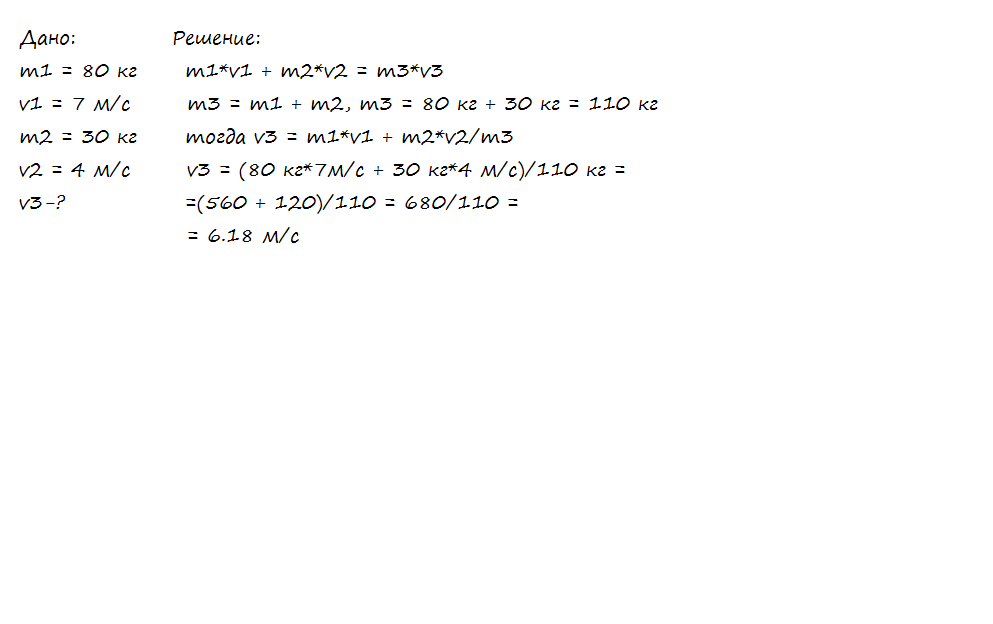 Человек массой 80 кг, бегущий сл скоростью 7м/с догоняет тележку массой 30 кг, движущуюся со скоростью 4 м/с и вскакивает на нее. Скорость тележки после этого