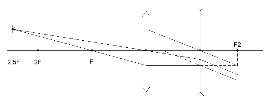 оптическая система состоит из двух тонких линз , главные оптические оси которых совпадают. Первая линза-собирающая,вторая-рассеивающая. Фокусное расстояние собирающей линзы F= 15 см. Расстояние между линзами F. Точечный источник расположен перед собирающей линзой на расстояние a=2,5F от неё. За линзами перпендикулярно их главным оптическим осям расположен экран. Определите фокусное расстояние рассеивающей линзы F2,при котором размер светлого пятна на экране не будет зависеть от удаления экрана от этой линзы.