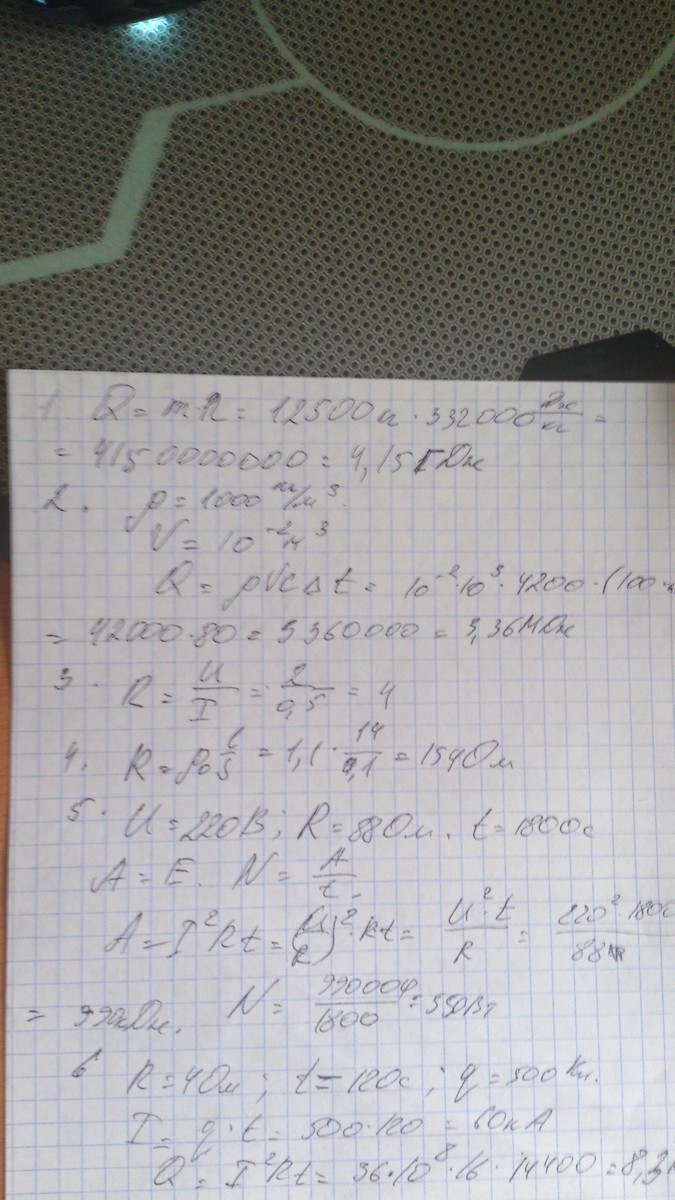 1.Какое количество теплоты необходимо, чтобы расплавить ледяную глыбу массой 12,5т при температуре плавления? Удельная теплота плавления льда 332 кДж/кг.2.Какое количество теплоты потребуется для нагревания 10 л воды от 20оС до кипения? Удельная теплоемкость воды 4200 Дж/(кг х С).3.При напряжении 2В сила тока в электрической цепи 0,5А. Найдите сопротивление резистора.4.Спираль электрической плитки изготовлена из нихромовой проволоки длиной 14м и площадью поперечного сечения 0,1 мм2 . Чему равно сопротивление спирали, если удельное сопротивление нихрома 1,1 Ом мм2/м?5.Электрический утюг рассчитан на напряжение 220 В. Сопротивление его нагревательного элемента равно 88 Ом. Определить энергию, потребляемую утюгом за 1800 с., и его мощность.6.По проводнику сопротивлением 4 Ом в течение 2 мин. прошло 500 Кл электричества. Сколько теплоты выделил проводник?