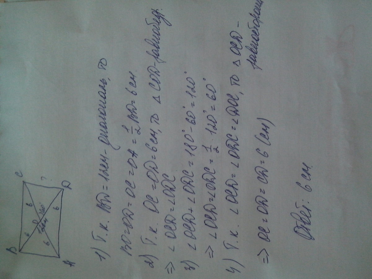 Найдите меньшую сторону прямоугольника, если его диагональ равна 12 см, а один из углов, образованных при пересечении диагоналей, равен 60 градусов.