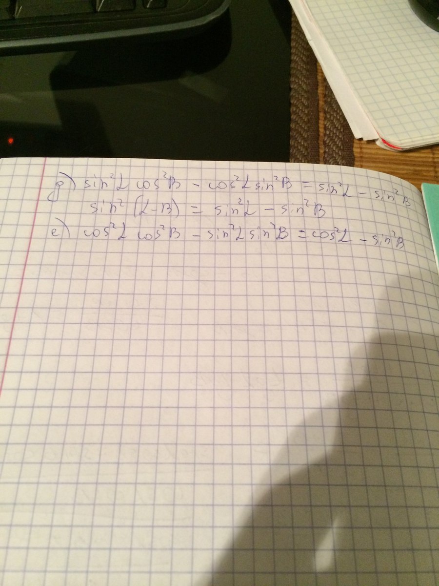 д)sin²acos²b-cos²asin²b=(sinacosb-cosasinb)(sinacosb+cosasinb)=sin(a-b)sin(a+b)=
