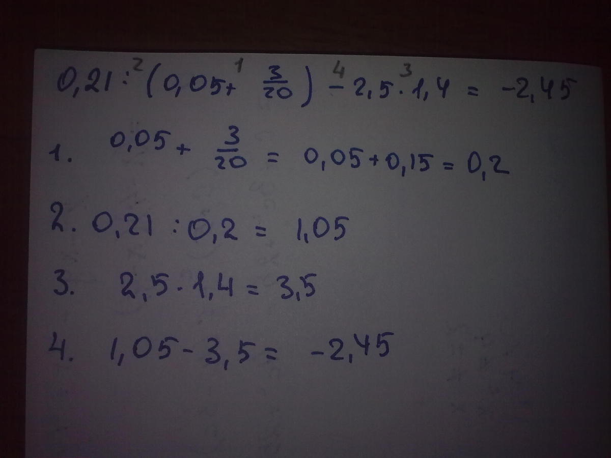 0,21:(0,05+3/20)-2,5*1,4= 0,21:(0,05+0,15)-2,5*1,4=0,21:0,2-3,5=1,05-3,5=-2,45