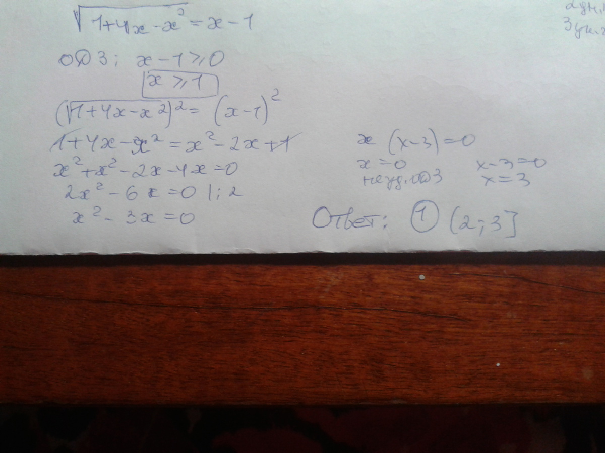 укажите промежуток, которому принадлежит корень уравнения √(1+4х-х^2)= х-1. Ответы:1) (2;3] 2) (3; 5] 3) (-2; 3) 4)[ 0; 1). пожалуйста, с полным решением.