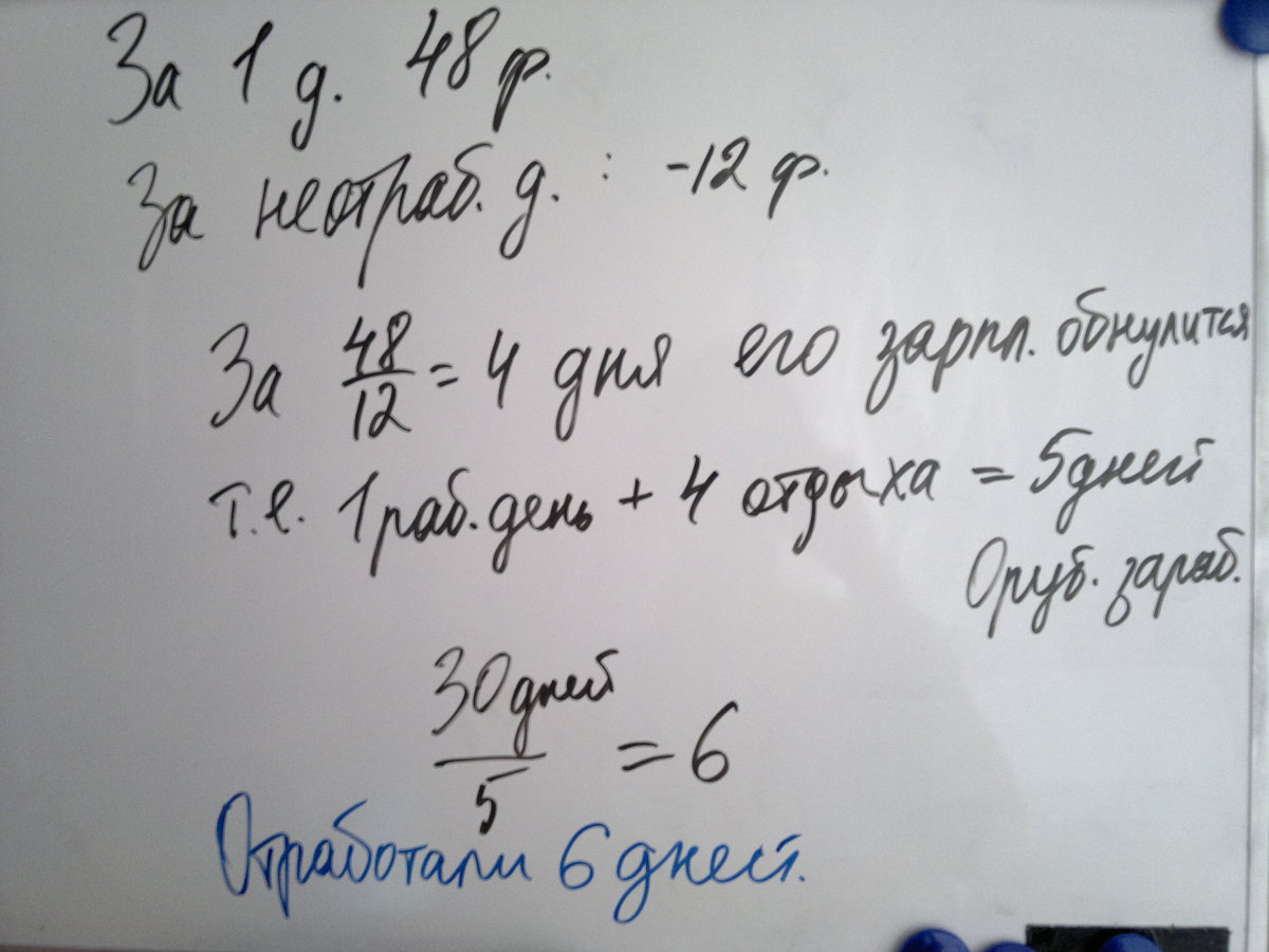 По контракту рабочим причитается по 48 франков за каждый отработаный день с них взыскивается по 12 франков.Черед 30 дней работы выяснилось,что работникам ничего не причитается.Скольки дней они отработали на самом деле за это время?