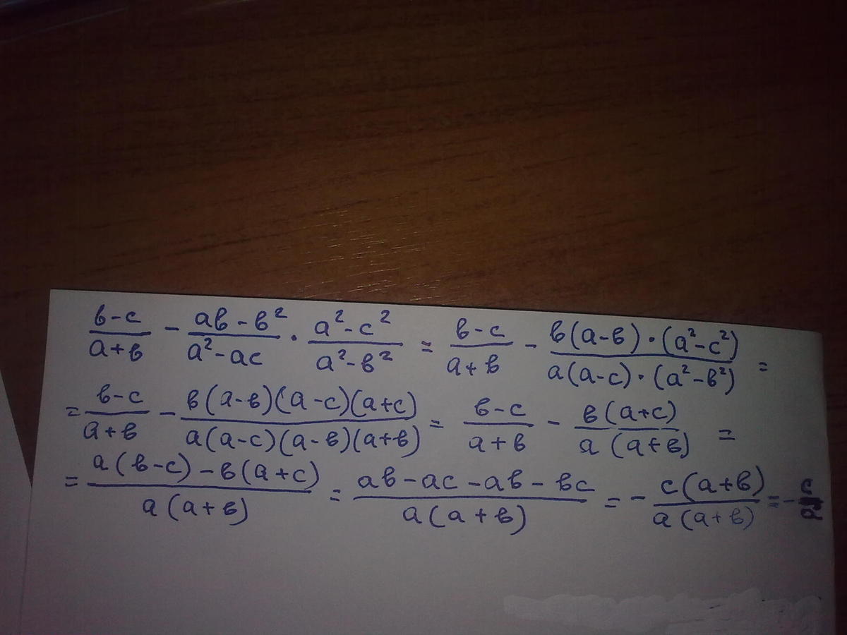 2)b-ca+b - b*(a+c)a*(a+b) = a*(b-c)-b*(a-c)a*(a+b) =ab-ac-ab+bca*(a+b)=bc-aca*(a+b) =c*(b-a)a*(a+b)=-c*(a+b)a*(a+b)=-ca