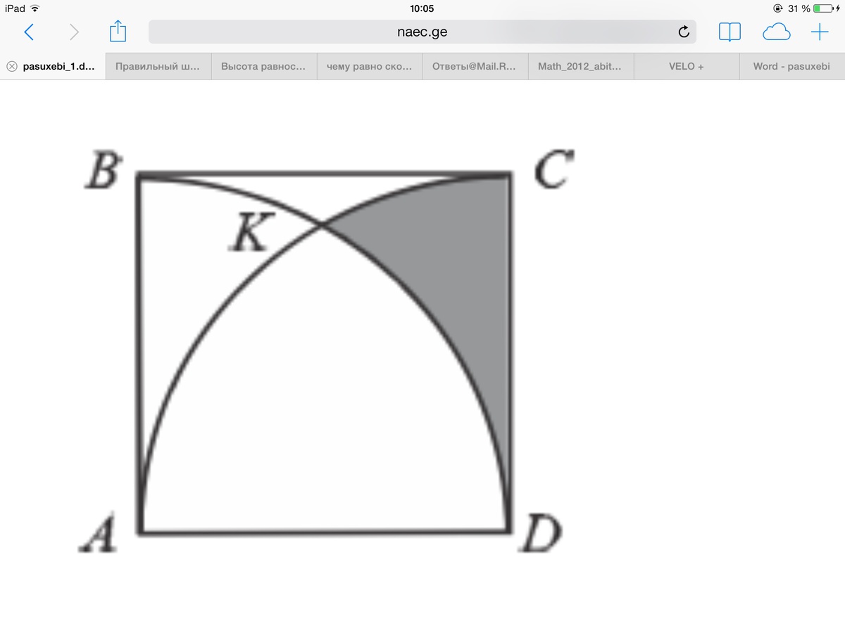 Сторона квадрата равна- а. Из точек А и D как из из центра окружностей проведены окружности. Найти площадь закрашеной области. Помогите срочно!!!