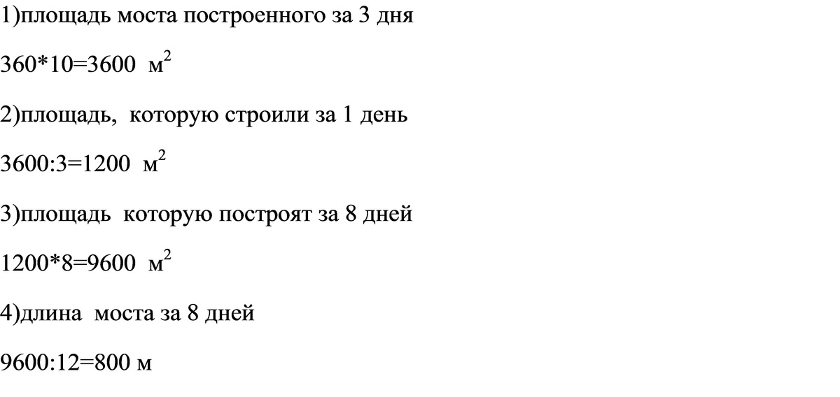пожалуйста помогите! рабочие за 3 дня построили мост длиной 360 м, шириной 10 м. сколько метров длины моста шириной 12 м они построят за 8 дней? плииииз прошууу!