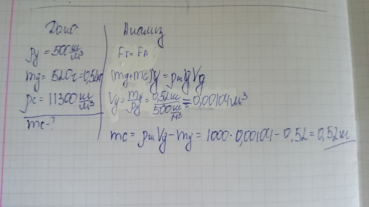 Кусок дерева (плотность=500 кг/м3) массой 520г плавает в воде. Какой наименьший массы (кг) кусок свинца надо закрепить на него, чтобы он утонул? Плотность свинца 11.3 г/см3.
