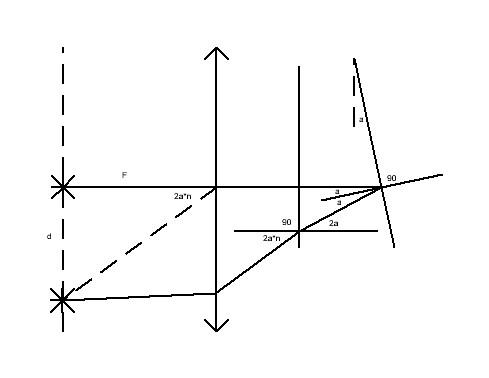 На некотором расстоянии от собирающей линзы с фокусным расстоянием f расположен стеклянный клин с малым преломляющим углом a. По другую сторону от линзы в её главном фокусе расположен точечный источник света S. На каком расстоянии d друг от друга соберутся лучи, отраженные от передней и задней поверхностей клина после прохождения линзы. Показатель преломления стекла n.