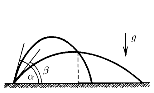 Из отверстия шланга, прикрытого пальцем, бьют две струи под уг-лом α и β к горизонту с одинаковой начальной скоростью v. На каком расстоянииот отверствия по горизонтали струи пересекутся?