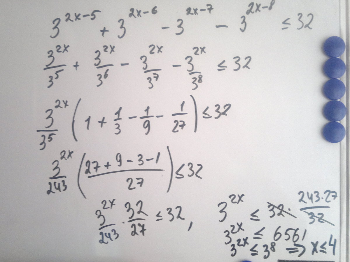 Решите неравенство 3в степени2x−5 +3в степени 2x−6 −3в степени2x−7 −3в степени2x−8меньше или равно32.