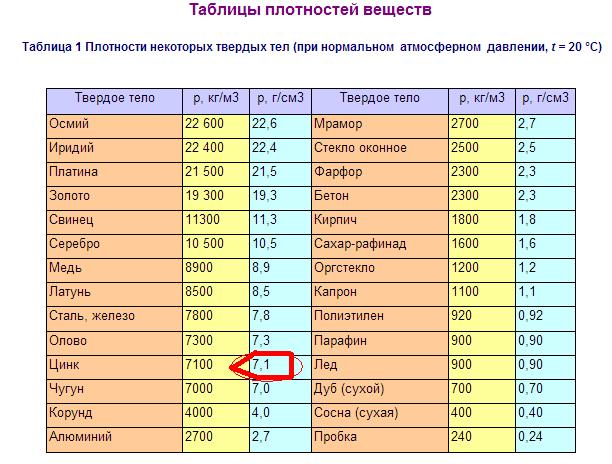 Далее в справочнике по таблице плотностей твердых тел находим по результату что это цинк Если таблица попадется что в ней только плотность указана в кг/м^3 , тогда 7.1 г/см^3 надо перевести в кг/м^3 (умножая на 1000)