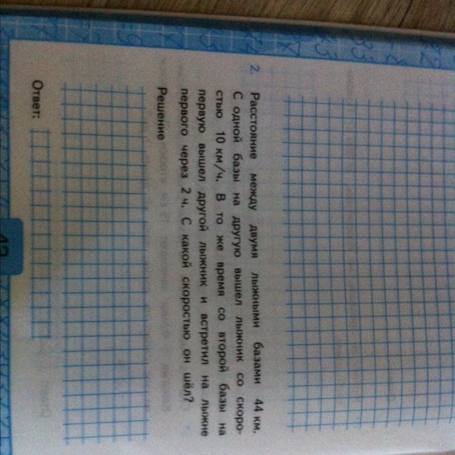 за 2 часа он прошел 10*2=20 км, т.к. лыжники встретились => второй лыжник прошел 44-20=24 км за те же 2 часа