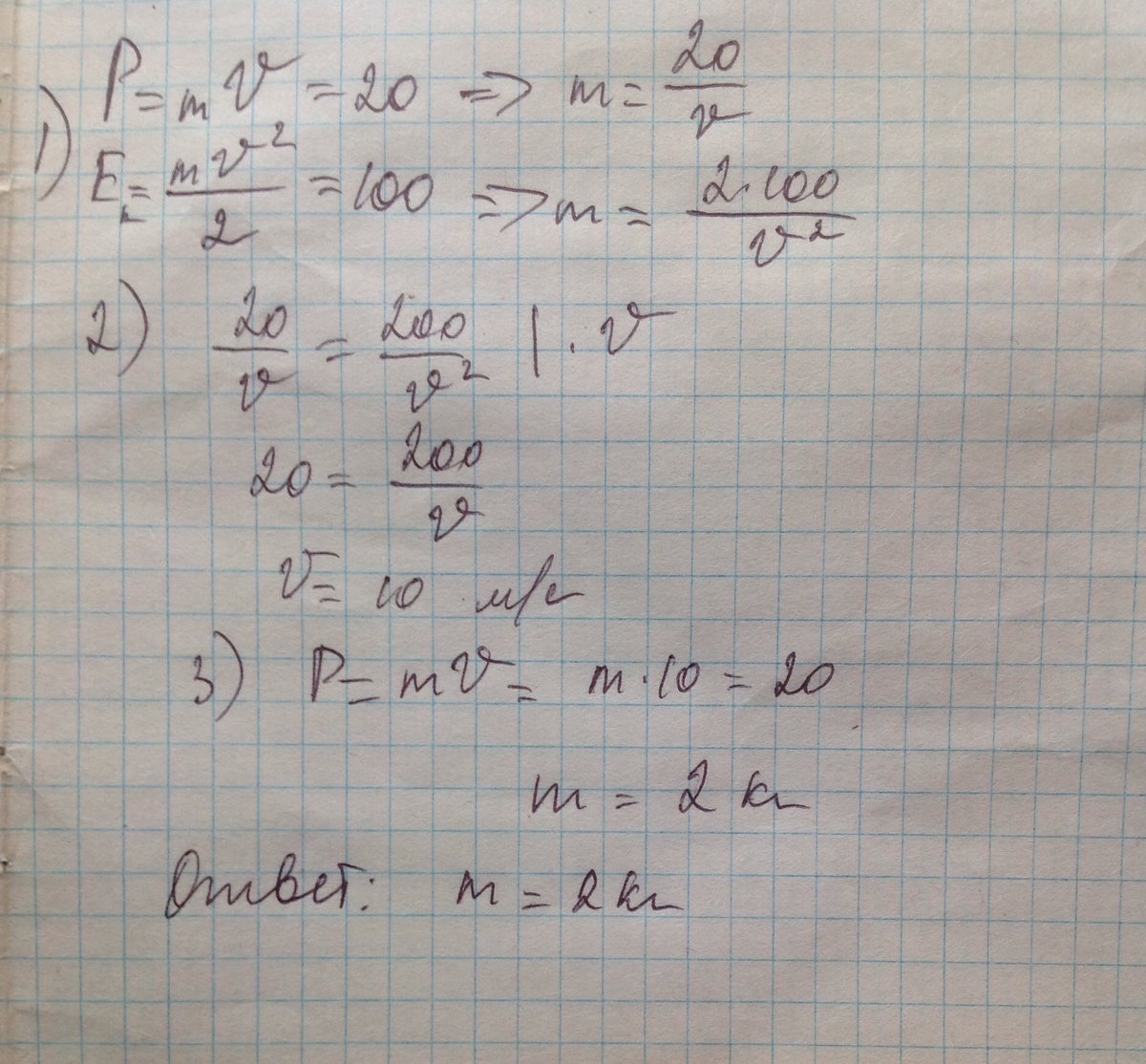 определить массу тела, движущегося с импульсом равным 20 кг на м/с и кинетической энергией - 100Дж.