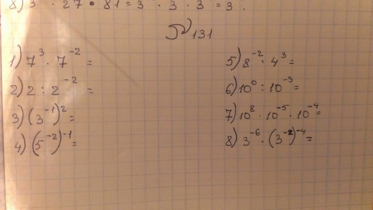 1) 7. 2) 8. 3) 1/9. 4) 25. 5) 1. 6) 1000. 7) 1/10. 8) 9