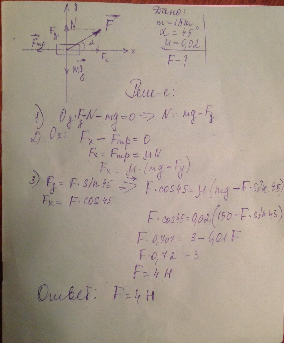 мальчик тянет сани массой 15 кг под углом 45 градусов к горизонту , при этом сани движутся равномерно . Найти величину приложенной силы ( H ), если коэффициент трения саней о дорогу 0.02.