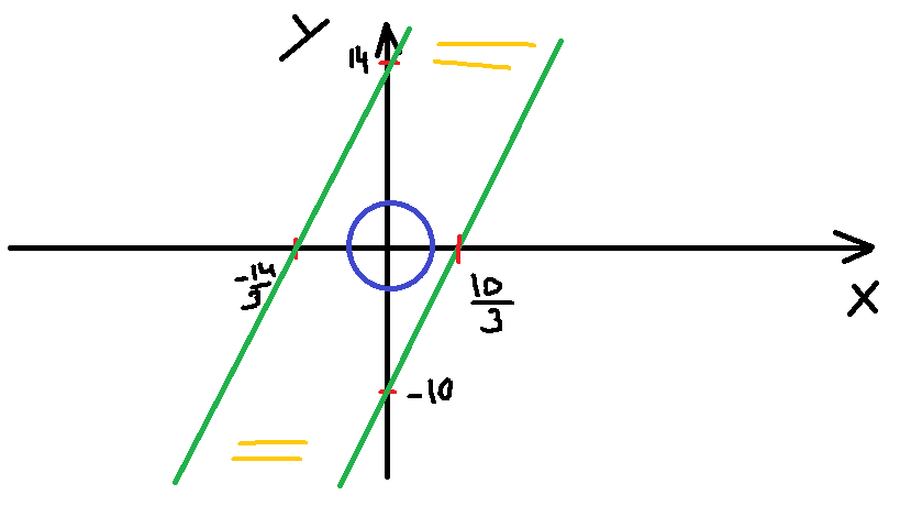 Как-то так. Ваши два графика. Интересует нас область которая между ними (я показал ее такими желтыми палочками). Также я нарисовал круг, который является 2 частью исходной системы. При а=0 он будет выглядеть именно так. Теперь ключевой момент. Точка вершины вашего "круга" будет ходить по прямой y=-x/3. Считается это так: при а=1 точки вершины: y=-1. x=3. тогда y=-x/3. Нам это важно, потому что нам надо знать, куда "поедет кружок". Чтобы было одно решение, кружок должен касаться одного из графиков неравенств. Просто потому, что при а=0 решений бесконечно много. Теперь придется это считать. Окружность касается прямой, когда дискриминант равен нулю. Рассмотрим касание левой прямой и окружности. Подставим значение y из (1) в уравнение окружности: