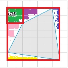 Площадь четырехугольника= площадь большого квадрата минус площади синего, сиреневого, розового и желтого треугольников минус площадь зеленого квадрата.