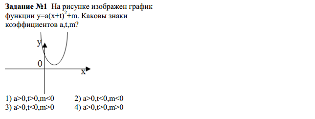 помогите пожалуйстапомогите пожалуйста На рисунке изображен график функции у=а(х+t)2+m. Каковы знаки коэффициентов а,t,m?