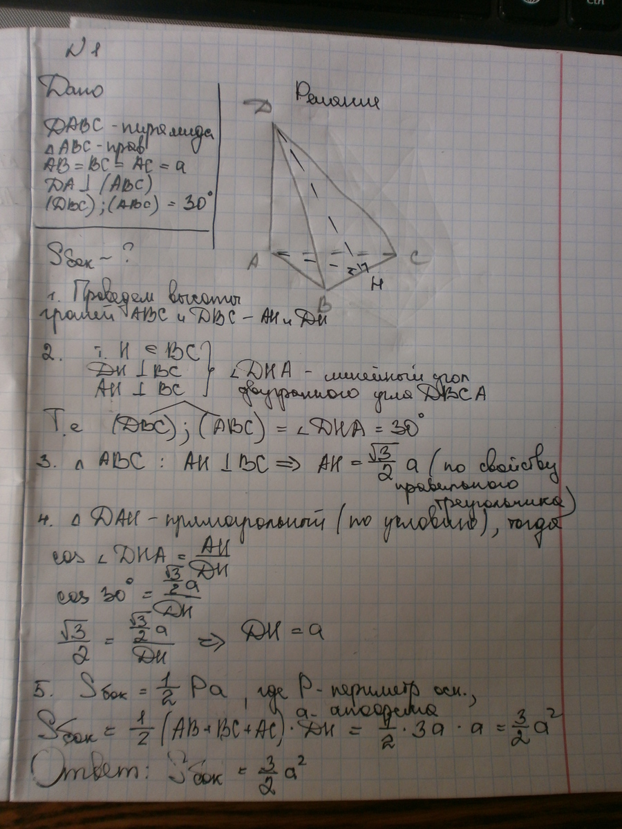 1. Основанием пирамиды DABC является правильный треугольник ABC, сторона которого равна а. Ребро DA перпендикулярно к плоскости ABC, а плоскость DBC составляет с плоскостью ABC угол 30°. Найдите площадь боковой поверхности пирамиды.