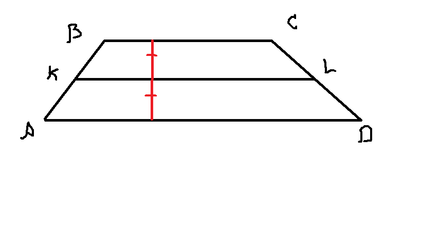 Пусть BC=a, AD=b, KL=(a+b)/2. Тогда отношение приобретет вид: