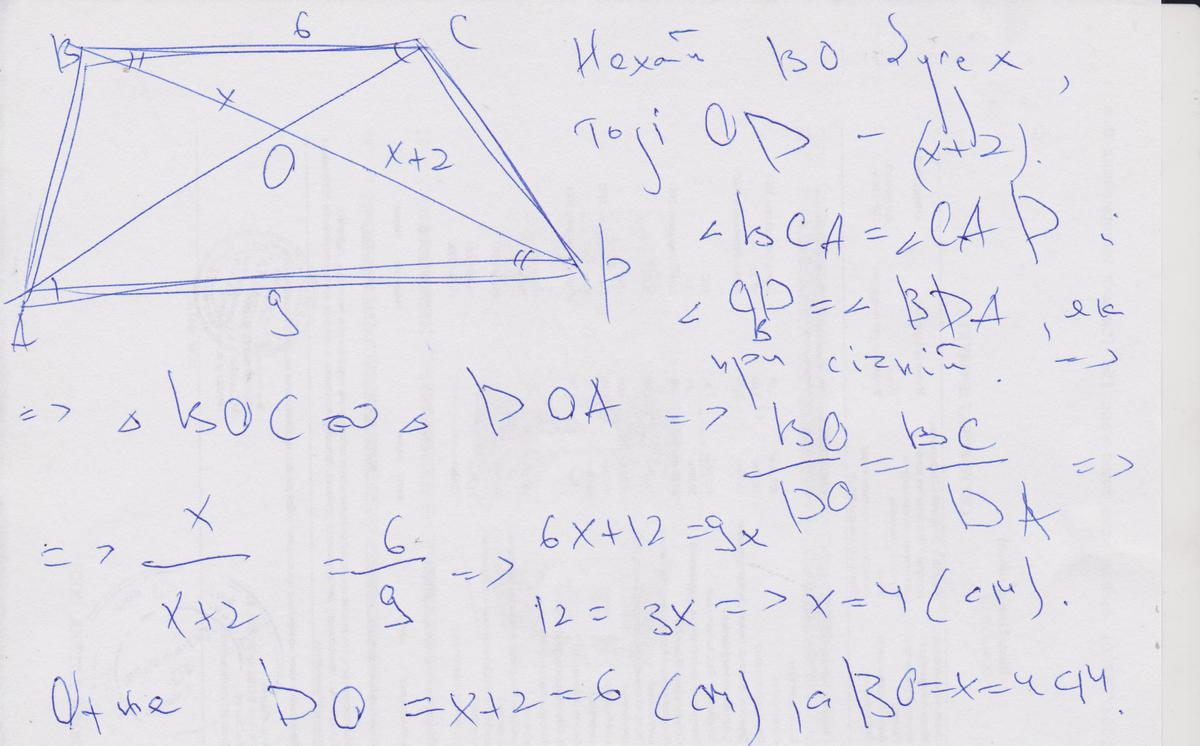 О- точка перетину діагоналей трапеції АВСД,з основами АД і ВС,АД=9см,ВС=6см. Знайдіть відрізки ДО і ВО,якщо їх різниця = 2см