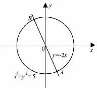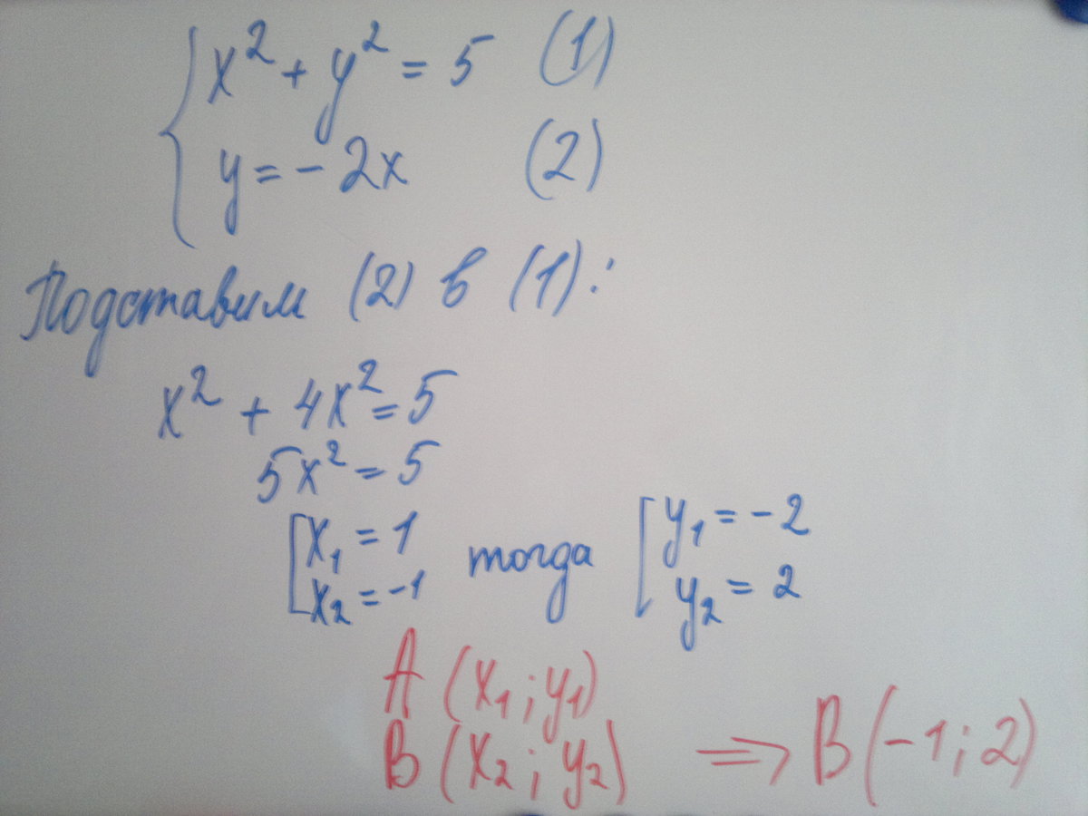 Окружность, изображённая на рисунке, задаётся уравнением x2 + y2 = 5, а прямая уравнением y = −2x. Вычислите координаты точки В.