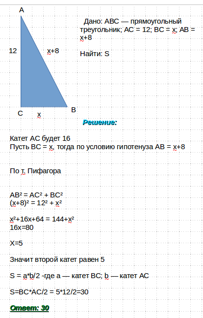 Один із катетів прямокутного трикутника дорівнює 12см, а гіпотенуза більша другого катета на 8см. Знайдіть площу трикутника.