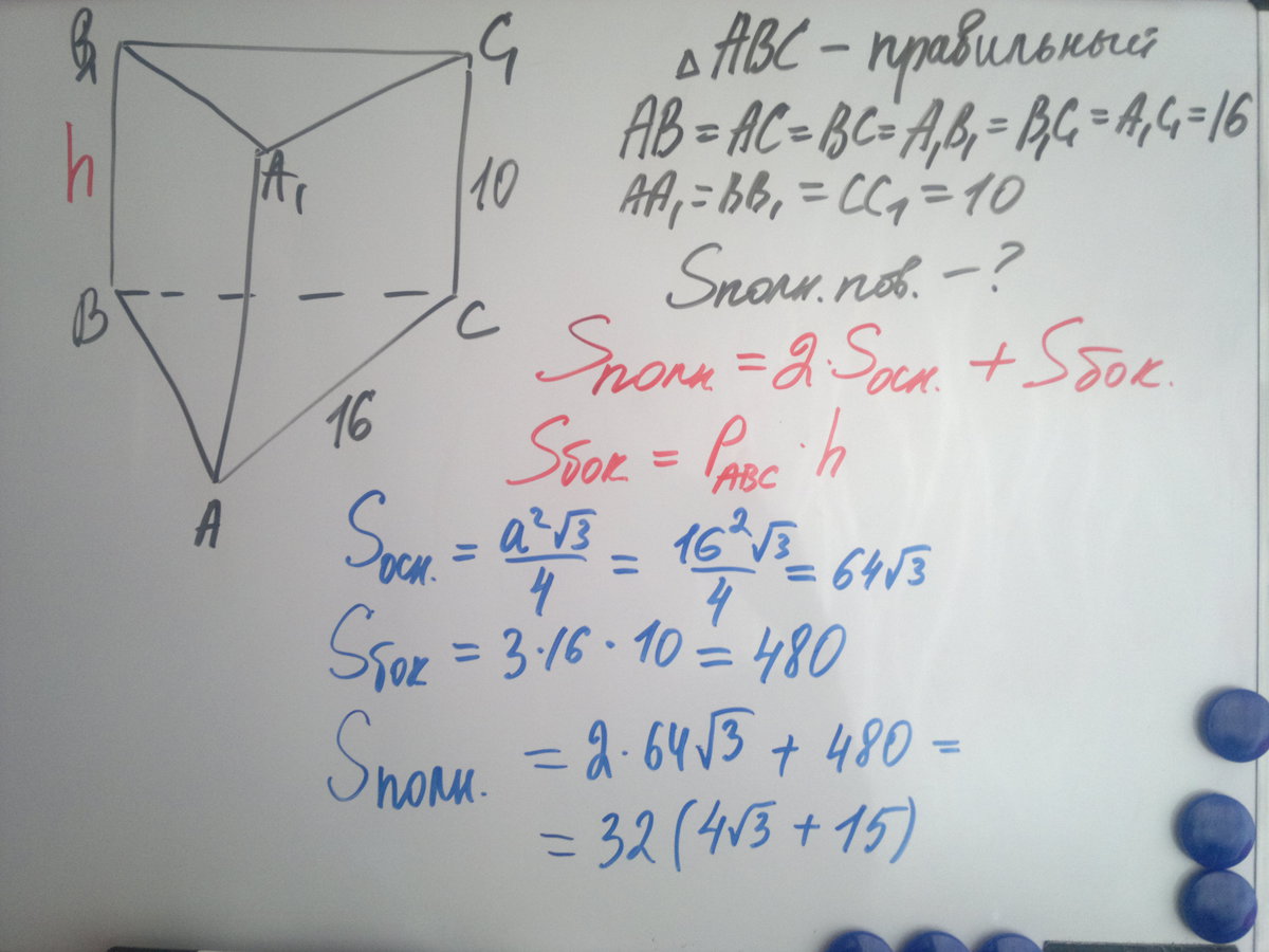 Сторона правильной треугольной призмы 16 см.,боковое ребро 10 см.Найти площадь полной поверхности призмы.ПОМОГИТЕ!!!!!