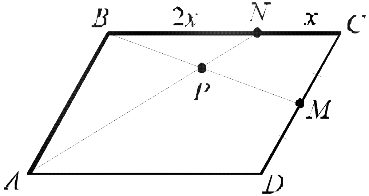 NC=x=DK, AD=3x. Рассмотрим пару подобных треугольников: ABF и DMF (по трем углам). То есть AF/DF=AB/DM=2. Теперь "поиграем" с отношением: