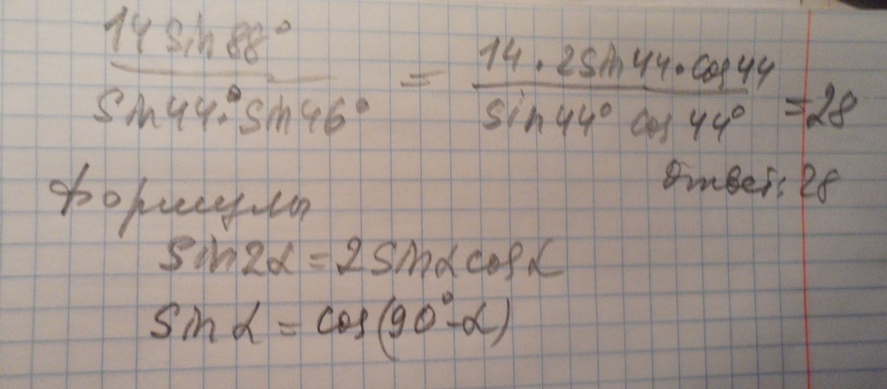 =14sin(90-2) : 1/2(cos(44-46)-cos(44+46))=14cos2:1/2cos2=28
