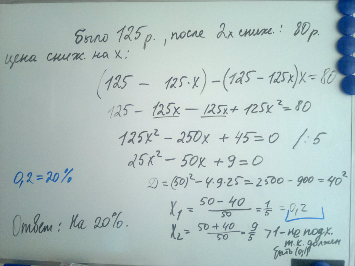 Цена товара после двух последовательных снижений уменьшилась с 125 до 80 р. На сколько процентов снижалась цена товара каждый раз?