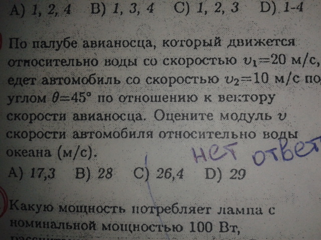 |v| = КОРЕНЬ((20+10*COS(pi/4))^2+(10*SIN(pi/4))^2) м/с=