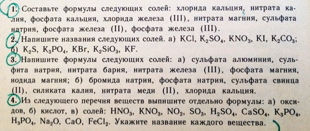 1) CaCl2, KNO3, Ca3(PO4)2, FeCl3, Mg(NO3)2, Na2SO4, Fe3(PO4)2, FePO4 (чтобы составить формулы надо знать степени окисления элементов и кислотных остатков)