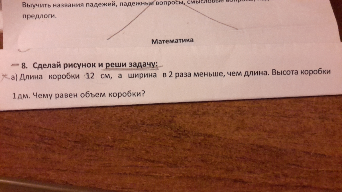 Сделай рисунок и решил задачу: Длина коробки 12 см, а ширина в 2 раза меньше, чем длина.Высота коробки 1 дм.Чему равен объем коробки?