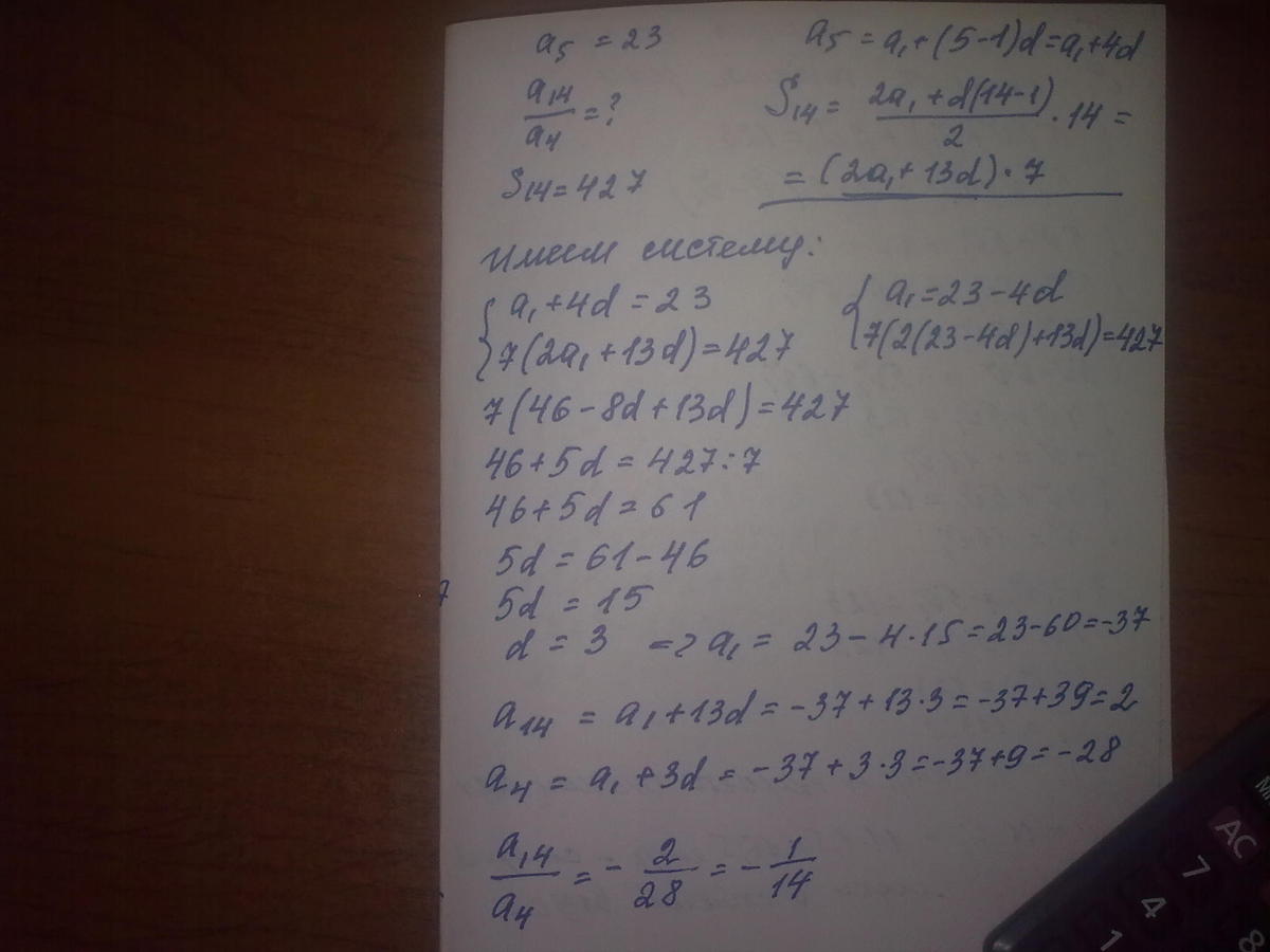 Сумма первых 14 членов арифметической прогрессии равна 427, а пятый член равен 23. Найдите отношение четырнадцатого члена к четвертому. Можно в подробностях